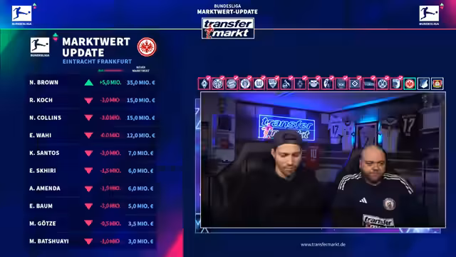 03:30:02Frankfurts defensive Schwächen spiegeln sich in den Marktwerten wider. Robin Koch verzeichnet einen Wertverlust als Kapitän der schwächsten Abwehr der Liga. Besondere Aufmerksamkeit gilt Elias Baum, der trotz hoher Erwartungen nach dem Wechsel aus der 2. Liga keine Spielzeit erhält. Der Rechtsverteidiger wurde von zahlreichen Bundesligisten umworben, entwickelt sich aber nicht wie erhofft. Torhüter-Karussell zwischen Kaua Santos und Zetterer sowie Altersabwertungen bei Götze und Buta waren weitere Themen.