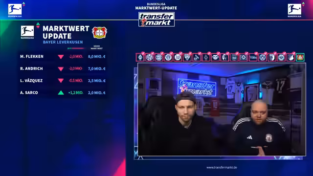 03:47:40Die Altersabwertung von Grimaldo (+30) löste intensive Diskussionen aus - trotz weltweit höchstem Marktwert für Außenverteidiger seiner Altersklasse. Leverkusens Talentförderung glänzt weiterhin: Florian Wirtz (110 Mio.), Maser (+13 Mio. auf 20 Mio.) und Kossounou (25 Mio.) zeigen steile Entwicklungskurven. Schicks Verletzungsanfälligkeit und Alexandre Lacazettes Abgang wurden thematisiert. Intern wurde besonders über Jonas Hofmanns internationale Perspektiven diskutiert.