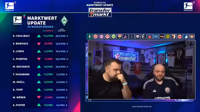 00:21:27Die Moderatoren beginnen mit Werder Bremen und diskutieren die markantesten Änderungen. Justin Koulibaly wird als eines der größten Talente hervorgehoben und erhält eine deutliche Aufwertung auf 12 Millionen Euro aufgrund seines Potenzials und der Premier-League-Interesse. Boniface hingegen wird aufgrund schwacher Leistungen von 25 auf 12 Millionen Euro abgewertet. Jens Stage bleibt unverändert, was als implizite Anerkennung gewertet wird. Torhüter Michael Backhaus steigt auf 7 Millionen Euro nach konstant guten Leistungen. Die Diskussion umfasst auch Spieler wie Nicolai Rapp und Nick Woltemade, deren Werte kleinere Anpassungen erfuhren.