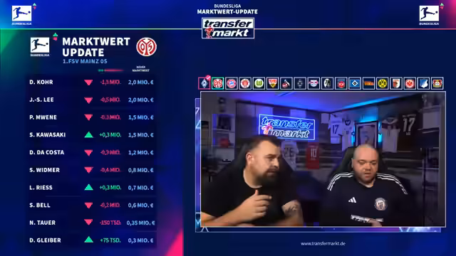 00:39:55Mainz 05 verzeichnet deutliche Abwertungen im gesamten Kader, was die schwache Tabellenposition widerspiegelt. Spieler wie Paul Nebel (von 24 auf 18 Millionen Euro) und Nadiem Amiri (von 15 auf 12 Millionen Euro) werden aufgrund mangelnder Leistung und Altersfaktoren angepasst. Jonathan Burkardt und Nelson Weiper erhalten ebenfalls Abschläge. Ein Lichtblick ist Kai Schusano, dessen Wert stabil bleibt. Zudem wird Kaspar Podulski als aufstrebendes Talent in der U23 erwähnt, der bei kontinuierlicher Entwicklung zukünftig stark aufwerten könnte. Insgesamt verliert Mainz rund 23 Millionen Euro an Marktwert.