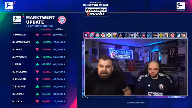 00:49:59Bei Bayern München steht Jungtalent Lennart Karl im Mittelpunkt. Sein Marktwert steigt signifikant auf 60 Millionen Euro, was ihn zu einem der wertvollsten U18-Spieler weltweit macht. Die Moderatoren vergleichen ihn mit internationalen Talenten wie Estevão (Chelsea) und betonen die Bedeutung seiner Entwicklung für die Nationalmannschaft. Gleichzeitig wird Jamal Musiala trotz Rückkehr von einer Verletzung leicht abgewertet, da globale Top-Spieler wie Bukayo Saka ähnliche Korrekturen erfuhren. Die Diskussion unterstreicht Bayerns Strategie, junge Talente großzügig zu bewerten, wenn sie sich etablieren.