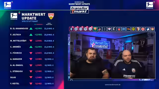 01:33:31Angus Stiller (26) bleibt trotz konstanter Leistungen beim VfB Stuttgart unverändert bei 45 Millionen Euro. Kritik der Fans entgegnet Transfermarkt mit dem Hinweis auf fehlende neue Impulse: Keine Nationalmannschaftsnomination, keine gesteigerte Transfermarkt-Dynamik (Real Madrid-Interest blieb folgenlos). Dagegen erhalten Youngster wie El Canus (+5 Mio. auf 15 Mio.) und Koulibaly-konkurrent Rico Yeltsch (+4 Mio. auf 30 Mio.) Aufwertungen. Max Mittelstädt (28) verliert 2 Mio. durch geringere Außenverteidiger-Transferwerte und Nationalmannschafts-Rückstufung.