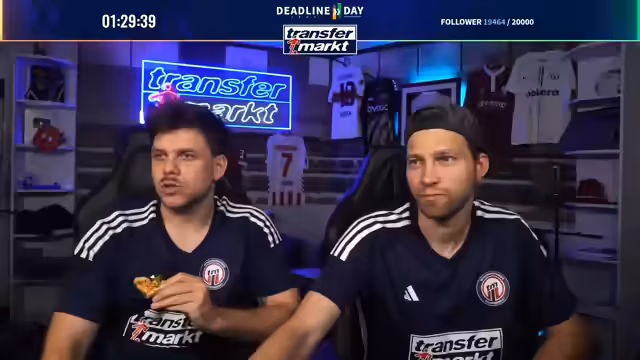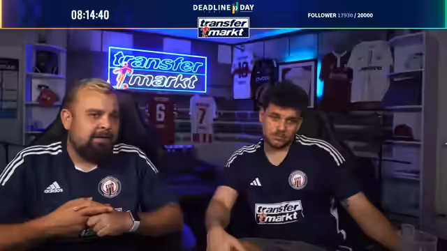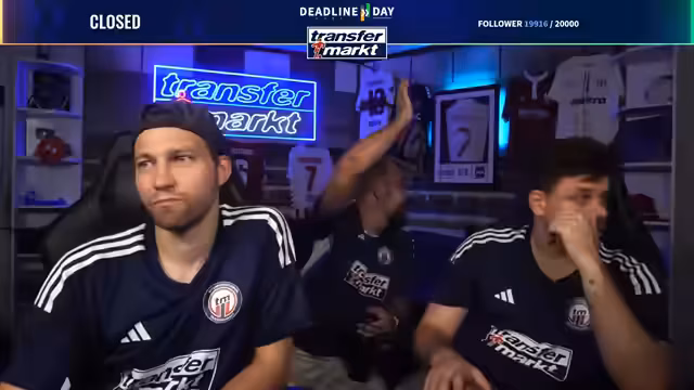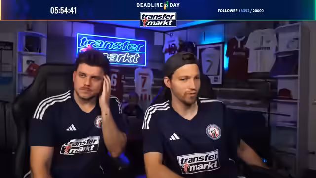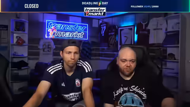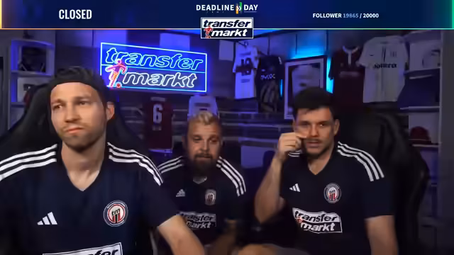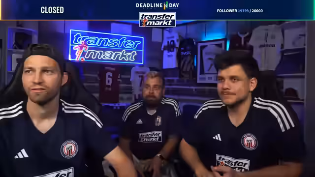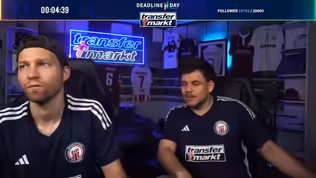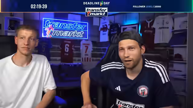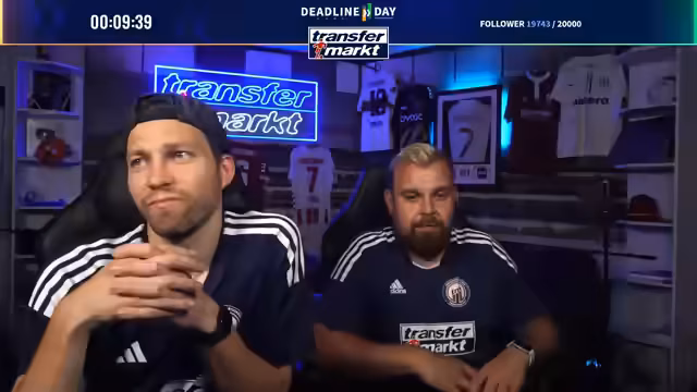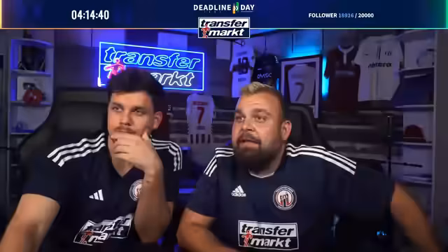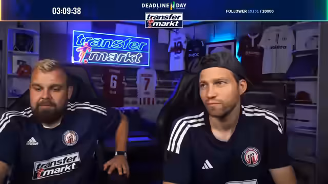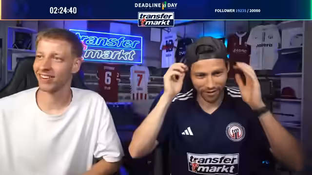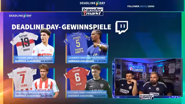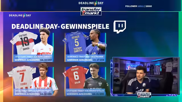 09:27:26Zum Abschluss des Deadline-Day-Streams werden mehrere Gewinnspiele für die Community gestartet. Als Hauptgewinn wird ein von Angelo Stiller unterschriebenes Trikot verlost. Für die Teilnahme ist ein Follow auf Twitch erforderlich. Zusätzlich wird ein weiteres, umfangreiches Paket verlost, das Flaschenöffner, Bieruntersetzer mit Transfermarkt-Fragen, eine Tippkick-Torwand und Socken der Marke transfermarkt enthält. Das Gewinnspiel läuft für die nächsten 15 Minuten und ist eine Belohnung für die steigende Followerzahl, die während des Streams die Marke von 20.000 erreicht hat.