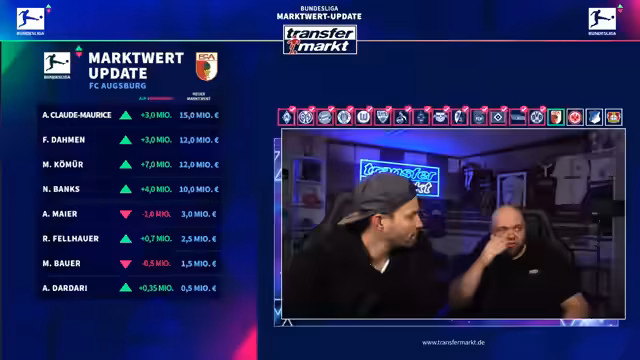 03:22:40Bei FC Augsburg werden mehrere Talente wie Kymyo und Banks positiv bewertet. Kymyo zeigt Flexibilität und Potenzial, weshalb sein Wert steigt, trotz Interesse der Türkei. Banks wurde von Roma mit 10 Mio. € umworben; sein Wert steigt aufgrund guter Spiele und physischer Stärke. Pellhauer, von Elversberg kommend, etabliert sich in der zweiten Liga. Die Diskussion betont, dass Talente bei Vereinen wie Augsburg bei gezielter Förderung schnell an Wert gewinnen können.
