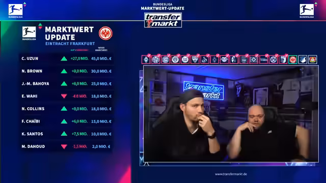03:30:34Can Uzun hat nach einem ruhigen Aufbau beim Saisonstart durchgestartet und seinen Marktwert von 17 Mio. € auf 45 Mio. € gesteigert. Frankfurt könnte ihn für 80 Mio. € verkaufen, aber Analysten halten dies für zu ambitioniert. Uzun wird mit Spielern wie Ekitike und Kolo Muani verglichen, die höhere Werte erreichten. Es wird diskutiert, ob der aktuelle Wert zu hoch gegriffen ist, da Uzun noch nicht die Qualität dieser Spieler hat. Trotzdem ist sein Entwicklungsschritt beachtlich.