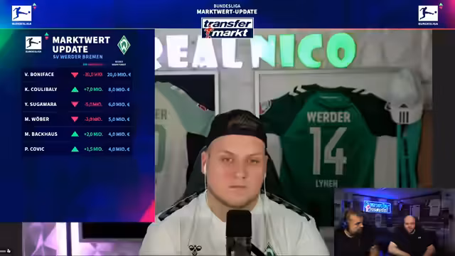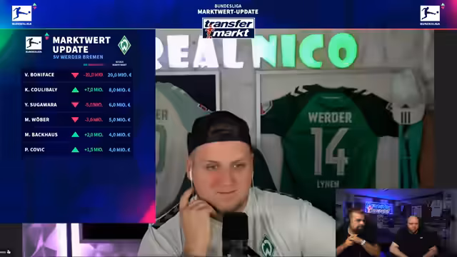 00:33:15Mit RealNiko werden die neuen Marktwerte von Werder Bremen besprochen. Viktor Bonifacius erleidet den größten Verlust des Updates, sein Wert halbiert sich von 40 auf 20 Millionen aufgrund eines gescheiterten Transfers zu Milan und Verletzungsproblemen, bleibt aber dennoch der wertvollste Spieler im Kader. Trotzdem wird sein Potenzial bei zukünftiger Fitness betont.
