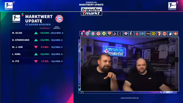 01:16:19Das Bayern-Update konzentriert sich auf Michael Olise, der auf 130 Millionen Euro aufgewertet wurde. Dies wird mit seinen starken Leistungen in der Premier League und dem aktuellen Transfermarktumfeld begründet. Upamecano steigt auf 50 Millionen Euro, während Kim Min-jae und Hiroki Ito (Verletzungen) abgewertet werden. Besonders umstritten ist die Aufwertung des 17-jährigen Lennart Karl auf 1 Million Euro – als Talentscout antworten, wird mit hohen Transfersummen für vergleichbare junge Spieler (z.B. Diomande) argumentiert. Tom Bischof bleibt unverändert, da er kaum Spielzeit bekommt. Es wird diskutiert, dass Bayern-Talente höher bewertet werden, wenn sie sich durchsetzen.