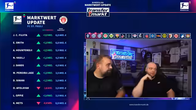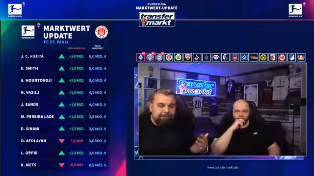 01:31:15St. Pauli verzeichnet mehrere Verdopplungen: Fujita (2 auf 4 Mio.), Oppi (0,6 auf 3 Mio.), Huntongi (1 auf 2 Mio.) und Sinani (2 auf 4 Mio.). Oppis Wert steigt durch feste Ablöse und starke Integration. Vasil wird als Bundesliga-Top-Torwart eingestuft und leicht aufgewertet. Sands profitiert von Irvins Verletzung. Afolajan verliert eine Million aufgrund von Disziplinarstrafen und Statusverlust. Karol Metz sinkt wegen langer Verletzung, während Zwigala dank seiner Chancen nach Metz’ Verletzung auf 0,6 Millionen steigt. Kars und Irvine bleiben unverändert, wobei Irvine im Winter ein Altersdowngrade droht.