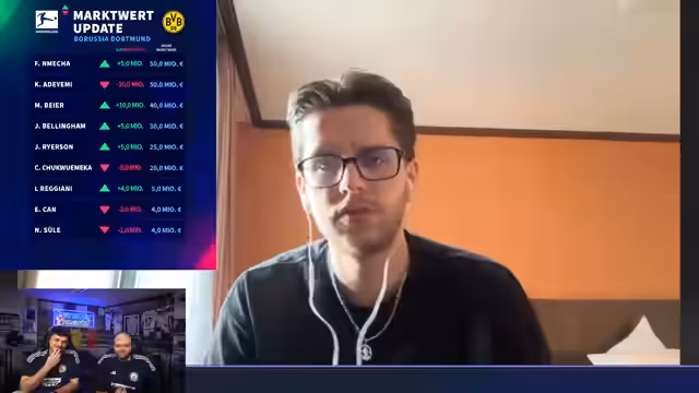 03:05:25Für den Dortmunder Julian Ryasson (im Text als Riasson genannt) wurde der Marktwert auf dem Höhepunkt seiner Karriere gesehen, da seine hohe Anzahl an Vorlagen eine Overperformance war. Für ein Alter von 25 Jahren ist der nun festgelegte Wert für einen Außenverteidiger fair. Jude Bellingham hat nach starken Leistungen in den letzten Wochen wieder an Profil gewonnen, weshalb er ein kleines Stück aufgewertet wurde. Die Situation wird im Sommer neu bewertet.