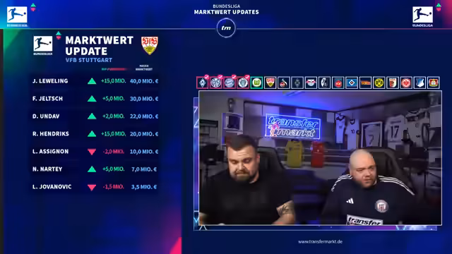 01:26:00Beim VfB Stuttgart stehen große Aufwertungen im Fokus. Labeling erhält eine massive Aufwertung auf 40 Millionen Euro, gestützt auf Scorer-Leistungen und Interesse aus der Premier League. Auch andere Spieler wie Undaf (letztmalige Aufwertung vor dem 30. Geburtstag) und Jorquez profitieren. Eine Diskussion entsteht um Wagnoman, dessen Wert trotz Potenzial und Verletzungsanfälligkeit hinter Mittelstädt liegt, da dieser konstantere Höhen gezeigt hat.