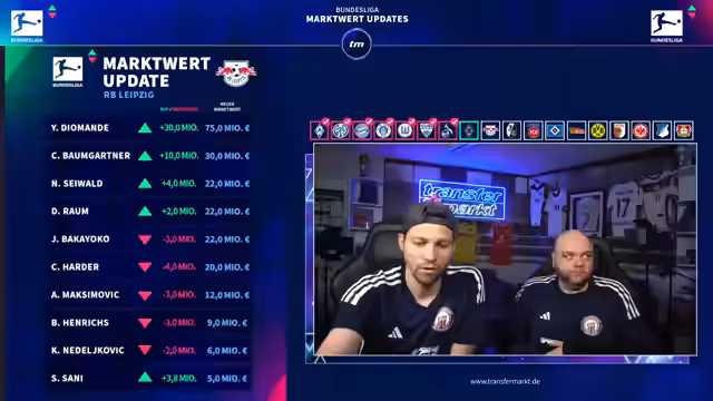 02:14:55Jan Diomande ist der mit Abstand größte Gewinner des Updates. Sein Marktwert wurde von 45 auf 75 Millionen Euro erhöht und macht ihn zum drittwertvollsten Spieler der Liga. Diese Entwicklung wird als gerechtfertigt angesehen, da er zu einem der gefragtesten jungen Talente weltweit avanciert ist. Die Experten führen seinen schnellen Aufstieg auf seine Einzigartigkeit als extrem schneller Flügelspieler mit hohem technischen Niveau zurück. Sie erwarten, dass seine Marktwerte im Sommer weiter steigen werden, da Top-Klubs bereits Interesse bekundet haben.