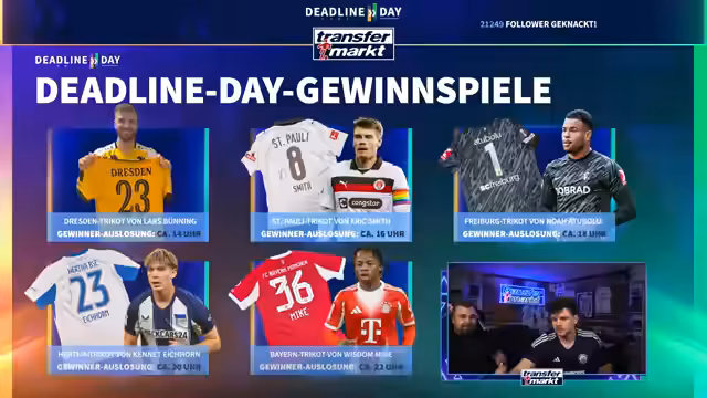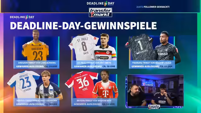 07:14:05Zum Ende des Streams werden die verbleibenden Gewinnspiele angekündigt. Um 20 Uhr wird das auswärts Trikot von Kenneth Eichhorn verlost, das vom Spieler selbst signiert ist. Um 22 Uhr soll das Heimtrikot des FC Bayern ausgelost werden. Der Streamer bedankt sich bei den Zuschauern für das Mitfiebern und die rege Teilnahme im Chat während des gesamten Transfer-Specials.