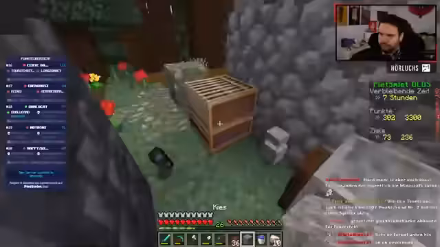 00:10:20Zu Beginn des Streams steht das Ziel im Vordergrund, den Nether zu betreten und wichtige Achievements zu sammeln, um in der DLDS-Tabelle aufzuholen. Es findet eine Taktikbesprechung statt, bei der die geplanten Aktionen wie der Bau eines Verzaubertisches, das Craften von Wurftränken der Schwäche und die Jagd nach einem goldenen Apfel für den Zombie-Dorfbewohner erörtert werden. Der Streamer plant zudem, verschiedene seltene Mobs wie Schnüffler und Axolotls zu finden und Achievements wie das Honigsammeln oder das Klettern am Honigblock zu erledigen, bevor sie in den Nether aufbrechen.