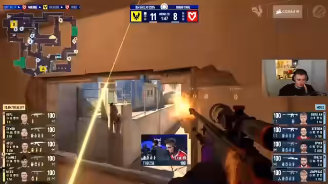 01:52:58Das Spiel bleibt bis zuletzt dramatisch und umkämpft. MOUZ kämpft sich nach hinten heran und baut etwas Momentum auf. Vitality hingegen nutzt seine Erfahrung, um kritische Situationen zu meistern. Beide Teams kämpfen verbissen um jede einzelne Runde. Das Publikum ist gespannt, wie das Match ausgeht und welches Team den ersten Map-Punkt holen kann. Es ist ein klassisches Duell, das die Erwartungen an das Finale erfüllt.