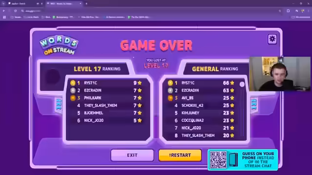 03:20:05Der Stream beginnt mit einem interaktiven Wortfindespiel für den Chat. Dabei müssen die Zuschauer aus einer variierenden Anzahl von Buchstaben englische Wörter bilden. Der Streamer leitet die Runde, gibt Hinweise zu gesuchten Wortlängen und lobt besonders gute oder kreative Vorschläge aus dem Chat. Das Spiel dient der Unterhaltung und Community-Beteiligung während der Pausen des Turniers.