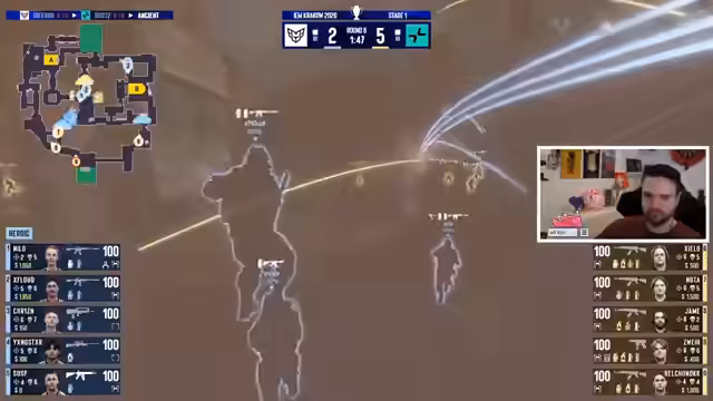 10:40:03Das Spiel geht in die zweite Runde mit G2, die mit einem Fast Buy starten. PassionUA startet stark. Es wird auf die Teamdynamik von G2 eingegangen, wo jeder Spieler zu seinen Kills kommen kann, und auf die Notwendigkeit, denkt der Streamer, sich als PassionUA früh zu positionieren. Die Map wird als ausgeglichen beschrieben, mit vielen dominanten Phasen von beiden Seiten.