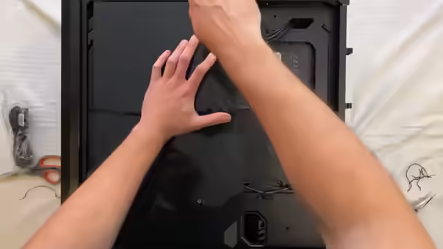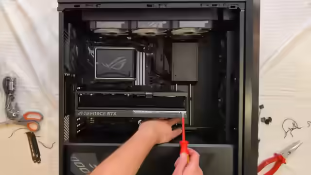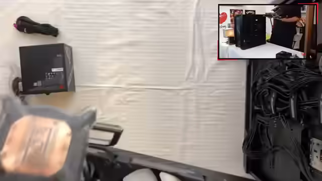 03:08:32Das CPU-Kabel wird ordentlich ins Netzteil gesteckt. Es wird überlegt, ob das Netzteil mit dem Lüfter nach oben oder unten eingebaut werden soll. Nach Rücksprache mit dem Chat wird entschieden, den Lüfter nach unten zu montieren, auch wenn die Schrift dann auf dem Kopf steht. Es werden die passenden PSU-Screws gesucht und gefunden. Das Netzteil wird festgeschraubt. Es wird festgestellt, dass das Netzteil über eine Grafikkartenüberwachung verfügt, die eine konstante Spannung gewährleisten soll. Das Netzteil wird mit Thumbscrews befestigt. Die Abdeckung wird vorbereitet, wobei das GPU-Kabel von unten durchgeführt wird. Die Abdeckung wird aufgesetzt und festgeschraubt. Das Grafikkartenkabel wird herausgezogen. Das Netzteil wird mit Kabeln verbunden, wobei auf die richtige Positionierung geachtet wird. Es werden zwei SATA-Kabel für den RGB-Hub benötigt. Die CPU-Kabel werden eingesteckt. Der dicke Motherboard-Stecker wird auf der Grafikkartenseite eingesteckt. Es wird festgestellt, dass weniger Kabel als beim letzten Mal benötigt werden. Das Netzteil wird mit Thumbscrews befestigt. An dem GPU-Kabel befindet sich ein pinker Stecker, der für die Grafikkartenüberwachung des Netzteils zuständig ist. Es wird erwähnt, dass die Grafikkarte, die AIO und die Kühler leuchten werden.