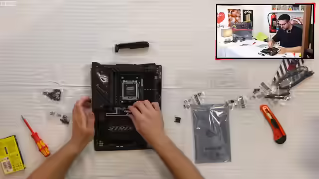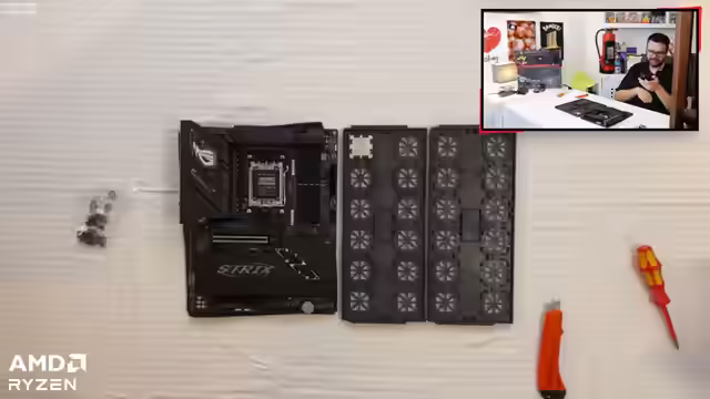 00:42:50Das Strix B850F Mainboard wird ausgepackt. Es wird festgestellt, dass die Kamera von oben eine gute Perspektive bietet. Die mitgelieferte Antenne wird nicht benötigt, da keine WLAN-Verbindung geplant ist. Es werden Sticker und Schrauben gefunden. Eine kleine Box enthält Kabelbinder, eine Netzteilabdeckung und Schrauben. Es wird entschieden, die Grafikkarte normal einzubauen und nicht vertikal. Die Aufkleber auf dem Motherboard werden entfernt. Es wird beschlossen, die Verpackung aufzubewahren. Die M2 SSD soll als erstes eingebaut werden. Das Mainboard verfügt über zwei Onboard PCIe M2-Steckplätze mit einem Q-Release-System, das das Aufschrauben überflüssig macht. Es wird der Aufkleber vom Heatpad entfernt, auf dem 'Remove' steht.
