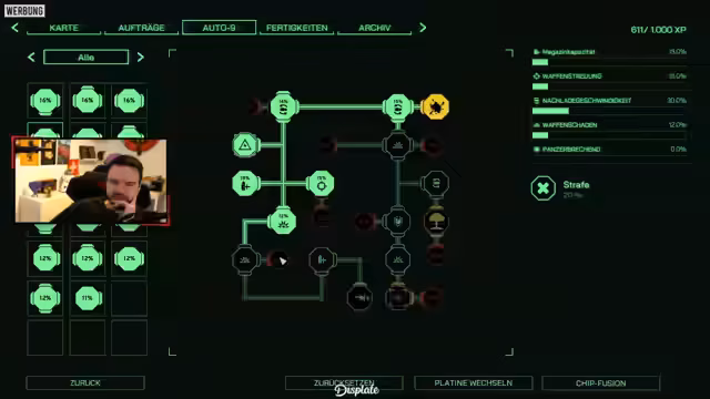 03:38:37Ein zentraler Teil des Streams widmet sich dem Upgradesystem. Der Streamer findet Chips, die in der Waffenplatine der Standardpistole 'Auto9' eingesetzt werden können, um deren Eigenschaften wie Schaden, Nachladegeschwindigkeit oder spezielle Effekte zu verändern oder zu verbessern. Nach anfänglicher Verwirrung über die Verbindungslogik der Chips gelingt es ihm, eine starke Konfiguration zu erstellen. Auch die Regeneration durch das Interagieren mit Sicherungskästen und die Verwendung von Fähigkeiten wie 'Slow Motion' werden getestet und als essentiell für den Überleben im Kampf identifiziert.