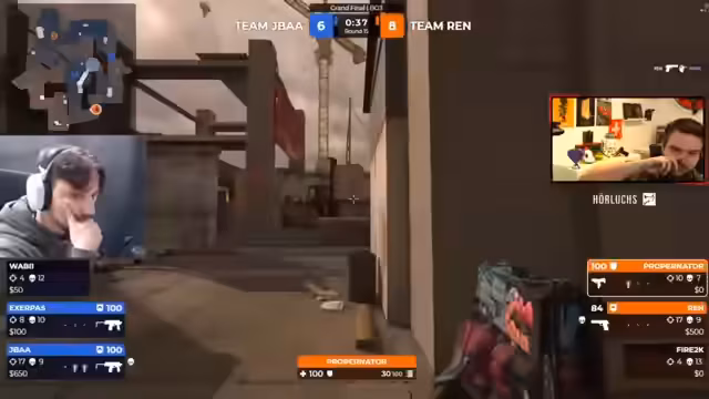 04:19:01Vor dem Start gegen Team Jabber wird die Map Construct von Team Trilluxe gebannt. Das Team entscheid sich für das T-Seiten-Setup und plant eine aggressive Taktik. Die Kommunikation unter den Spielern wirkt jedoch unkoordiniert, es kommt zu Missverständnissen bei der Positionierung und der Utility-Nutzung, was zu einem klaren Rückstand in der ersten Halbzeit führt.
