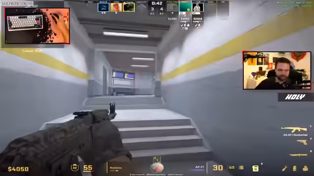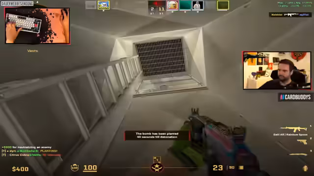 01:41:45Es wird ein spontaner Wallbang für Untergrund auf Overpass gezeigt, bei dem man zwischen zwei Steine schießt, nachdem man sich abgesmokt hat. Es wird ein Assist erzielt. Anschließend wird das Clip-Feature von Twitch kritisiert. Die Umsetzung sei noch nie gut gewesen und mit jeder Änderung schlechter geworden. Das Zusatzfenster wird als 'dogshit' bezeichnet. Es wird von einer kürzlichen Erfahrung berichtet, bei der zwei Clips benötigt wurden, was als absolute Katastrophe empfunden wurde. Es wird eine Situation geschildert, in der durch die Wand geschossen wurde, aber die Situation als schwierig eingeschätzt wird. Es wird beschlossen, Con hochzugehen, um die Lage zu erkunden und Spot zurückzugehen, um lang zu beobachten. Es wird erwähnt, dass jemand in der Mitte etwas gesungen hat, was der Streamer selbst war. Die Positionen der Gegner werden durchgegeben, darunter einer B lang und einer tief in A lang hinter einem Stein.