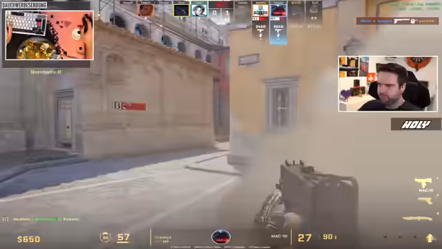 04:38:47Das Spiel beginnt mit hektischem Gameplay und strategischen Entscheidungen. Der Streamer und sein Team analysieren die gegnerische Position, planen Rauchvorhänge, um sich zu bewegen und Gegner zu überraschen. Es kommt zu intensiven Gefechten an strategischen Punkten wie Rampe, Heaven und Main, wobei beide Seiten aggressiv vorgehen und das Tempo des Spiels dauernd hochhalten. Die Kommunikation ist schnell und auf die wesentlichen Informationen beschränkt, um sofortige Reaktionen zu ermöglichen.