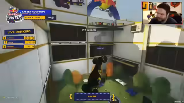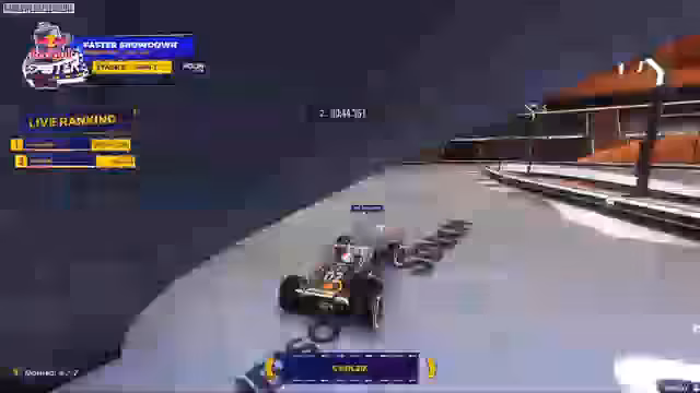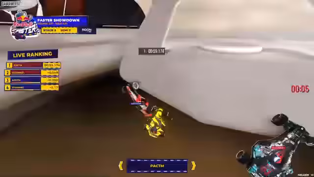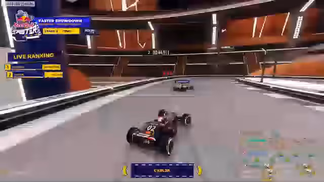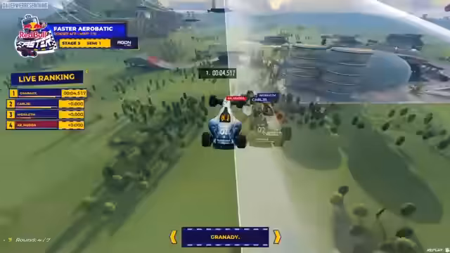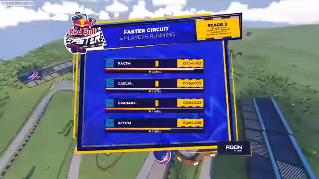 00:01:29Der Stream startet mit der Einführung des Red Bull Faster Turniers, eines 50.000 Euro Preisgeld-Events in Trackmania. Die dritte und finale Stage findet mit den Top 8 Fahrern, darunter Granadi, live in Milton Keynes statt. Ein neues, einzigartiges Knockout-Format wurde eingeführt, bei dem jeder Fahrer eine Lebensanzeige von 3 Sekunden besitzt. Die Zeit des letzten Fahrers wird von der Lebensanzeige der anderen abgezogen. Fällt ein Fahrer auf null Sekunden, hat er eine Last Chance und muss als nächster ins Ziel kommen, um im Rennen zu bleiben.