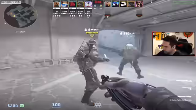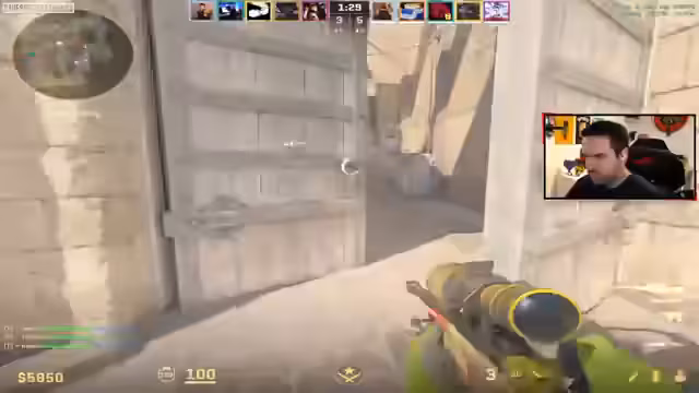 00:59:58Das Team startet in die zweite Map, Dust II. Eine strategische Entscheidung wird getroffen, T zu pushen und B zu faken. Der Plan scheitert jedoch, da die Gegner auf einen B-Push lauern und den Streamer früh eliminieren. Ein Mitspieler versucht, den Gegner aus einer vorteilhaften Position auf der 'Box' zu eliminieren, scheitert aber. Die Runde geht an das Gegnerteam.