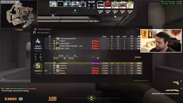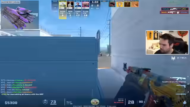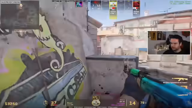 07:15:27Die Performance des Streamers und seiner Mitspiere ist sehr unterschiedlich. Der Streamer ist verärgert über eine Spielsituation, in der er 'mich aus der Verückung ficken lässt'. Er ist sich nicht sicher, warum ein Mitspieler schneller agieren kann, mutmaßt aber, dass dieser einen besseren Spawn-Punkt hat. Das Gefühl, 'gegen gute Leute' zu spielen, das ein 3k-Elo-Spieler in der Runde war, verstärkt den Frust und das Gefühl, benachteiligt zu sein.