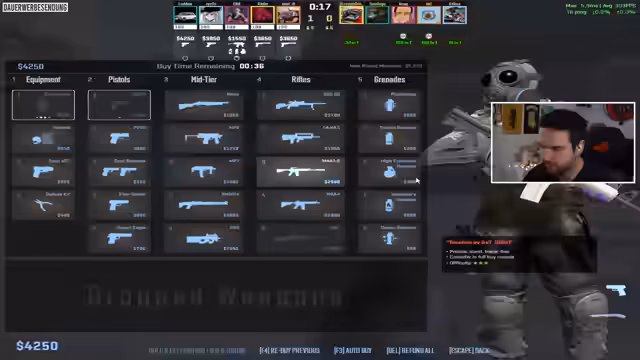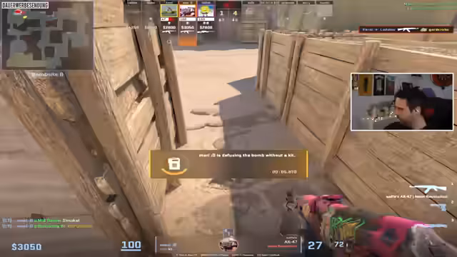 04:54:40Der Stream startet mit einem wilden Gameplay-Ausschnitt, in dem der Streamer einen Gegner mit einer Rauchgranate ablenkt und den Mitspieler Marius zum richtigen Vorgehen auffordert. Es folgt eine hitzige Runde, in der die Taktik, die Mitte zu kontrollieren, scheitert. Die Gegner nutzen Banane als Einfallstor, und die Kommunikation läuft nicht reibungslos, was zu unkoordinierten Bewegungen und Verlusten führt. Die anfänglichen Runden sind geprägt von Fehleranfälligkeit und unklaren Entscheidungen, was zu einer bedrohlichen 0-8-Situation führt.