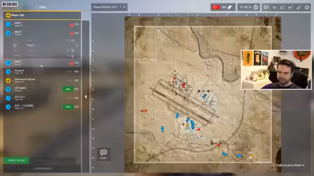 02:55:10Der Stream startet eine neue Runde, in der er und sein Mitspieler Dalu versuchen, sich einem deutschen Squad namens 'The Germans' oder 'Reapers' anzuschließen. Aufgrund von Wartezeiten, vollen Squads und unübersichtlichen Menüs gelingt der Zusammenschluss nur bedingt. Nach einer missglückten Landung und Verwirrung über Fahrzeugbesetzungen und Ziele muss der Angriff abgebrochen werden.