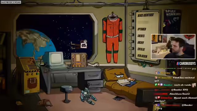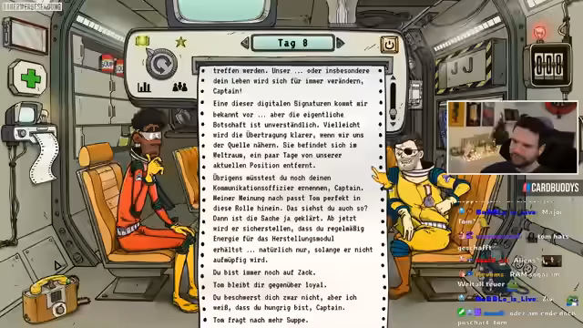 02:39:56Der Streamer startet das Spiel Sixty Parsecs, den Nachfolger von 60 Seconds. Das Spielprinzip wird erklärt: die Überlebenscrew in einem Raumschiff muss nach der Explosion der Erde eine neue Heimat finden. Ein neuer Captain wird ausgewählt, und die Crew aus Ted, Barbara, Timmy und Mary Jane wird vorgestellt. Das erste Ziel ist es, das Shuttle sicher zu verlassen und mit der Vorratshaltung zu beginnen.