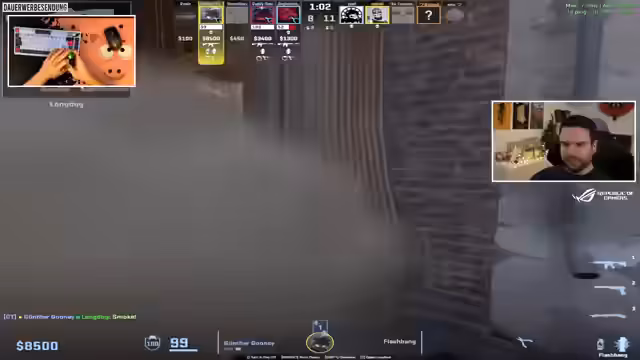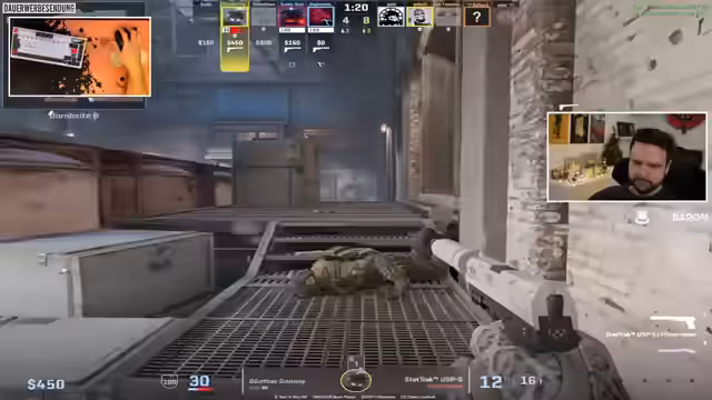02:05:05Nach dem Verlust einer Runde durch eine gespielte Bombe diskutiert das Team über die Taktik für den nächsten Zug. Es gibt Uneinigkeit über die Vorgehensweise, mit Vorschlägen, über die T-Mitte nach A zu gehen oder B erneut zu pushen. Der Streamer koordiniert die Bewegungen und versucht, seine Mitspieler durch klare Callouts für eine schnelle Aktion zu motivieren, während er selbst aktiv in den Konflikt eingreift.