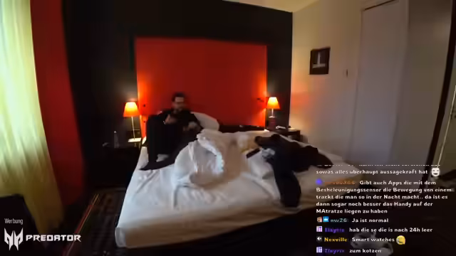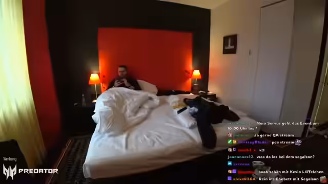 02:34:11Er schildert die positive Überraschung beim Check-in, da er und Kevin jeweils ein eigenes Einzelzimmer bekommen hatten, obwohl sie ursprünglich von einem Zimmer mit zwei Betten ausgingen. Dies ermöglicht es ihm, im eigenen Zimmer gemütlich mit den Zuschauern zu interagieren und eine Q&A-Session im Bett zu machen.
