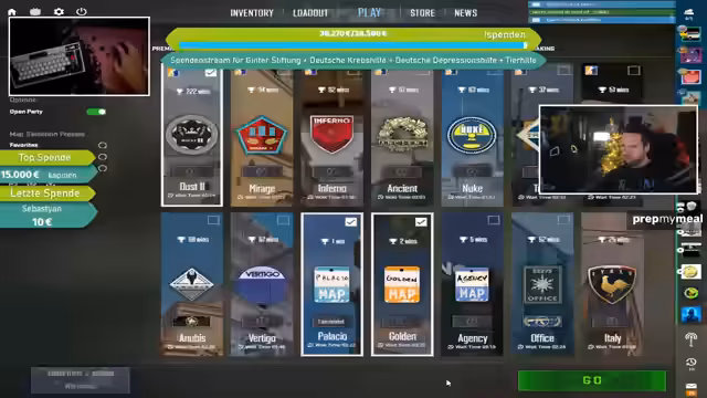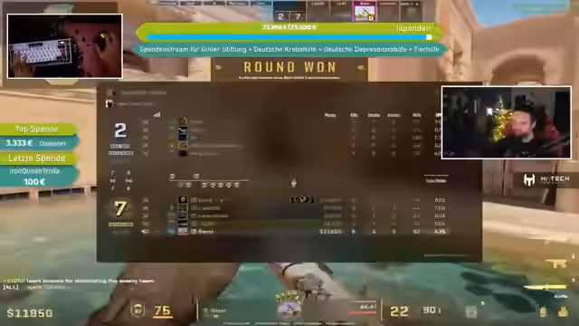 00:30:08Der Streamer äußert starke Erschöpfung durch erneut schlechten Schlaf (nächtlicher Lärm durch Küche und Putzkolonne). Nach Diskussionen über Premier-Modus und Fun-Lobbies (Anubis, Vertigo) wird ein Battlefield-Spiel als Abwechslung zu CS erwogen. Die Gruppe plant, den Adventskalender zu öffnen und das ASUS-Game-Way-Monitor-Giveaway durchzuführen, bevor knife-trading stattfinden soll. Ein kurzes YouTube-Intro wird vorbereitet, wobei die verbleibenden 10 Teilnehmer genannt werden.