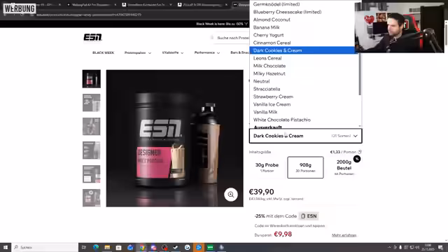 02:54:41Die ESN Black Week wird angekündigt, die eine Woche lang läuft und Rabatte von bis zu 50% auf ESN-Produkte bietet. Obwohl ESN-Produkte als höherpreisig gelten, wird die hohe Qualität betont. Der Streamer verweist auf die Black Week als gute Gelegenheit, die Produkte auszuprobieren. Im Rahmen einer Kooperation durfte der Streamer Produkte im Wert von 1500 Euro für ein Giveaway auswählen, um Zuschauer zu motivieren und bei ihren Sportzielen zu unterstützen. Die Verlosung erstreckt sich über sieben Tage, wobei heute drei Gewinne vergeben werden: eine Garmin Forerunner 55 Smartwatch, ein verstellbares Kurzhantelset und ein 150 Euro ESN-Paket. Die Teilnahmebedingungen besagen, dass Teilnehmer mindestens 18 Jahre alt sein und ihren Wohnsitz in Deutschland haben müssen. Der Spekulatius-Flavor Powder, der erst heute um 12 Uhr gelauncht wurde, ist bereits ausverkauft, was den Streamer verärgert, da er diesen gerne selbst probieren wollte. Weitere neue oder restockte Produkte sind Germknödel, Blueberry Cheesecake und Designer Reispudding.