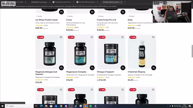 02:35:15Nach einer kurzen Pause für den Streamer wird eine Giveaway-Aktion angekündigt, die im Rahmen einer Black Week-Partnerschaft mit ESN stattfindet. Der Streamer ist eine Woche lang mit ESN gepartnert und hat ein Budget von 1500 Euro erhalten, um Produkte für die Verlosung auszuwählen. Zu den Preisen gehören zweimal die Garmin Forerunner Laufuhr/Smartwatch, ein Walking Pad (Laufband), das von anderen Streamern wie Galoo, Kevin und Marc benutzt wird, zweimal ein verstellbares Kurzhantelset, eine Pull-Up- und Dip-Klimmzugstange sowie zwei ESN-Bundles. Der Streamer teilt auch seine persönlichen Erfahrungen mit ESN-Produkten, da er seit Anfang des Jahres massiv abgenommen und mit Krafttraining begonnen hat. Er empfiehlt das IsoClear-Proteinpulver mit Lemon-Ice-Tea-Geschmack und zeigt eine Limited Edition Strohwaffel. Sein tägliches Frühstück besteht aus Magerquark, Haferflocken, Früchten, einem Scoop Proteinpulver und Kreatin, um auf mindestens 150 Gramm Protein pro Tag zu kommen und Muskeln aufzubauen. Er probiert auch das Almond Coconut Flavor Whey-Proteinpulver und erwähnt, dass er seit Februar 42 Kilo abgenommen hat. Zudem nimmt er täglich Omega-3-Kapseln, Magnesium und den Athlete Stack von ESN ein, um seinen Körper mit allen notwendigen Nährstoffen zu versorgen.