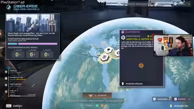 01:44:21Die vier Spieler starten als Helldivers auf der Supererde, um Städte zu verteidigen und an einer globalen Fortschrittsleiste mitzuwirken. Nach dem Start der ersten Mission werden die Aufgaben, wie das Verteidigen eines Generatorsystems und das Starten von Raketen, erläutert. Wichtig ist der Umgang mit neuen Gegnern und der Taktik, bestimmte Schwachpunkte wie blau markierte Stellen an den Beinen anzugreifen.