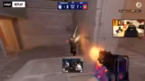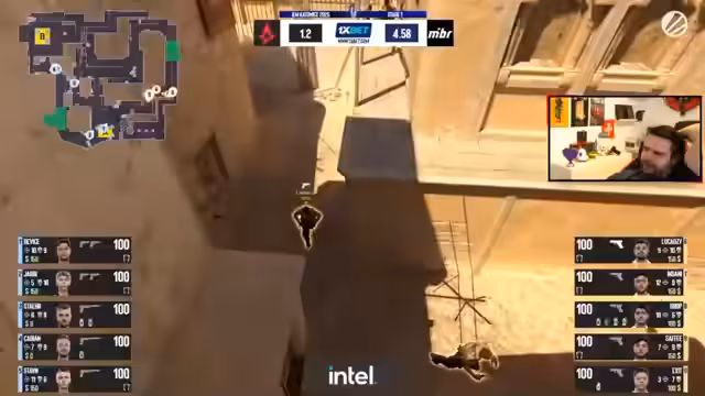 03:00:30Der Streamer kritisiert das nicht zentrierte und am Rand positionierte Bildschirmlayout, obwohl es als Zuschauer machbar ist. Er lobt die Kill-Anzeige als clean, zeigt mit Sternchen die Anzahl der Kills an und visualisiert den Schaden durch die HP-Balken. Auch die Granatendarstellung auf dem Radar wird positiv hervorgehoben, obwohl die Animation für Smokes nur ein GIF ist und keine Live-Anzeige.