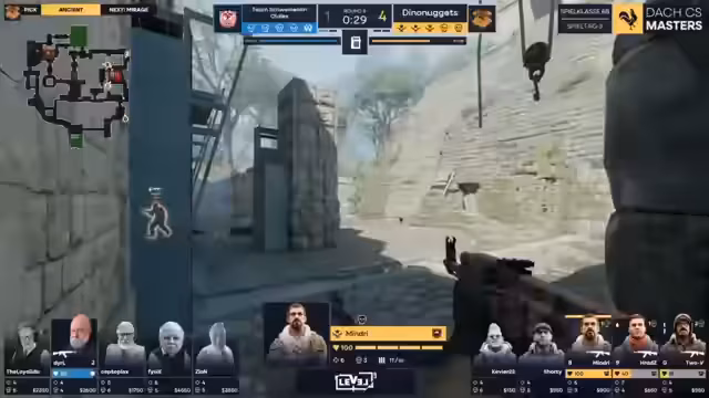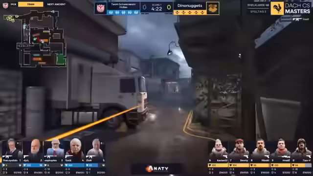 10:10:13Der professionelle Observer NET Jens wird für seine Arbeit gelobt, im Gegensatz zum Auto-Observer. Es wird die Abkürzung ADR (Average Damage Per Round) erklärt. Tobi führt mit 133 ADR, was bedeutet, dass er durchschnittlich 1,3 Gegner pro Runde ausschaltet. Die Dino-Nuggets starten einen Angriff auf den A-Spot mit einer Smoke für Donut. Zion pusht aggressiv und blockiert die Gegner mit einem Molotow, was sie zum Rückzug zwingt. Im Chat wird gefragt, warum der Observer heute so gut ist, was auf die professionelle Arbeit von NET Jens zurückzuführen ist.