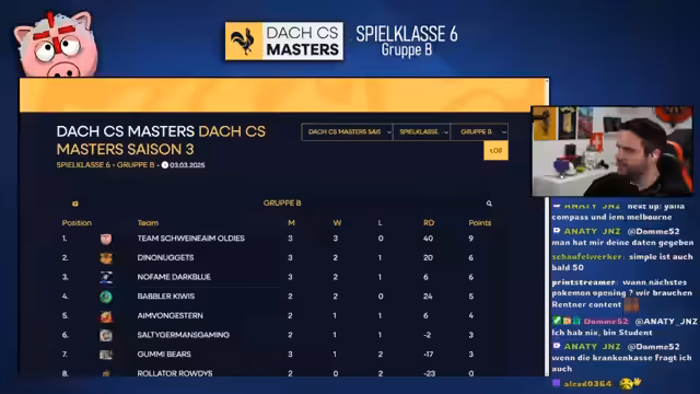 08:59:18Der Streamer begrüßt die Zuschauer zur DACH CS Masters Season 3 und kündigt das Spiel der Oldies gegen die Dino Nuggets an. Beide Teams haben bisher zwei Spiele gewonnen, wobei die Oldies eine leicht bessere Rundendifferenz aufweisen. Ein Sieg in diesem Spiel wäre wichtig für die Playoff-Chancen. Das Line-Up der Oldies wird vorgestellt: Patrick Loyaldo, Zion, Septoplex (zum ersten Mal dabei), Dürrl und Physix. Als professioneller Observer wird Jens von Anity dabei sein, der sonst auch bei großen ESL-Produktionen arbeitet. Die Map-Picks sind Train (Oldies), Ancient (Gegner) und Mirage als Decider.