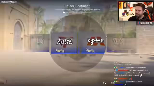 01:45:31Es wird eine ESL One Cologne 2015 Legends Foil Kapsel geöffnet, in der Hoffnung auf wertvolle Sticker wie Mouseboard oder Luminosity. Es wird über die Chancen und potenziellen Verluste diskutiert, bevor der Navi-Sticker gezogen wird, der jedoch nur einen geringen Wert hat. Anschließend wird eine Stickerkapsel 2 von Maoli geöffnet, in der Hoffnung auf den teuren Crown Foil Sticker. Stattdessen wird ein Bosch-Sticker gezogen, der nur wenige Euro wert ist. Trotz des enttäuschenden Ergebnisses wird festgestellt, dass es hätte schlimmer kommen können. Abschließend wird eine teure Waffenkiste 1 geöffnet, die 120 Euro kostet. Es wird gehofft, nicht die AOG Wings zu ziehen, da dies negative Erinnerungen hervorrufen würde. Um das Ergebnis zu enthüllen, wird das OBS-Fenster minimiert und auf den Chat geschaut.