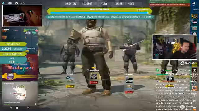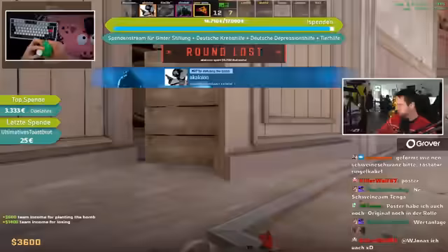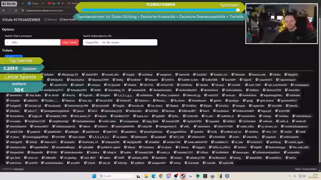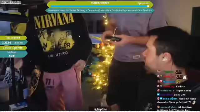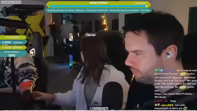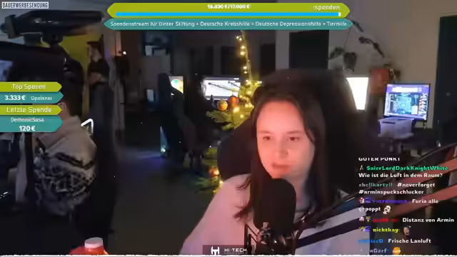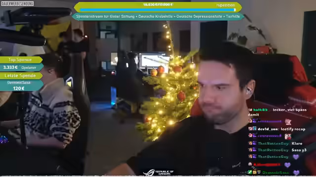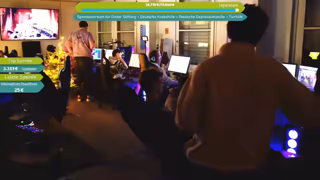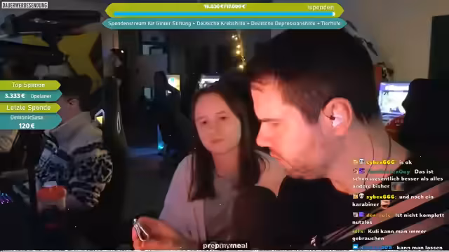 07:21:45Es wird ein Charity-Aufruf gestartet, bei dem Spenden an vier Organisationen gehen: Matze-Ginta-Stiftung, Deutsche Depressionshilfe, Deutsche Krebshilfe und Hunderettung Europa e.V. Die Hunderettung Europa ist auf Wunsch des Cutters Mattes (der sich selbst engagiert) aufgenommen worden. Die Spendenseite wird im Chat verlinkt, wobei die Spendenaktion im Rahmen des Weihnachts-LAN-Charity-Streams stattfindet.