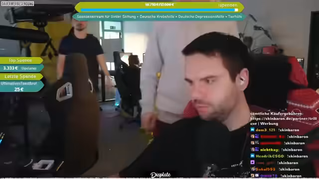 05:14:05Nach einer weiteren Spende von 'Raut Berlin' (100 Euro) wird der aktuelle Spendenzusammenhang analysiert: Bei einer Gesamtsumme von rund 17.200 Euro ergibt sich eine Verteilung von jeweils ~4.300 Euro auf die vier Wohltätigkeitsorganisationen (Matze-Ginter-Stiftung, Deutsche Depressionshilfe, Deutsche Krebshilfe, Hunderettung e.V.). Zeitgleich wird die verbleibende LAN-Dauer planfestgelegt: Ein Teil der Gruppe reist am Sonntag, der Rest am Montag ab. Die nächsten Trade-Up-Aktionen sind für Samstag und Sonntag angesetzt.