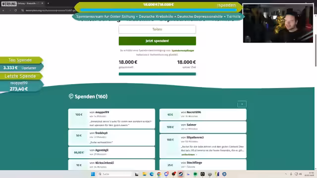 00:16:45Mit einer bedeutenden Spende von MasterChef über 16.500 Euro wird das bisherige Charity-Ziel vollständig erreicht. Dieser Rekordbeitrag löst sofort die Ankündigung eines neuen Ziels von 20.000 Euro aus, das in den nächsten drei Tagen angestrebt wird. Der Moderator betont die Begeisterung über die Großzügigkeit der Community und die Bedeutung solcher Spenden für die Charity-Aktion. Die Stimmung ist optimistisch, da das neue Ziel als machbar, wenn auch ambitioniert, beschrieben wird.