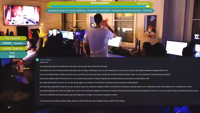 10:04:34Der Streamer initiiert eine humorvolle Schnitzeljagd, nachdem Armin seinen Toilettenschlüssel verloren hat. Rätsel führen zu verschiedenen Orten im Campingelände: Energie-Tankstelle (Küche), Vorratslager (Kühlschrank), Entspannungsbereich (Gesellschaftsraum) und lauter Ort (Bereich mit lauter Musik). Nachdem Armin den Code '1337' entschlüsselt, sucht er den 'Oger' (eine Person) auf und findet den Schlüssel schließlich im überfüllten Gesellschaftsraum, wo 20 Personen feiern. Das Ereignis wird als Vlog dokumentiert.