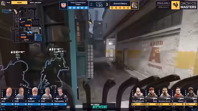 03:28:22Der Stream wechselt zu CS:GO, wo ein Match der 'Oldies' im Dach CS-Masters geladen wird. Das Team, bestehend aus Zion, Kagi, Tobi, Esgradin und Loyaldo, spielt gegen die Gummy Bears. Der Streamer stellt das Lineup und die Tabelle vor und erklärt die Bedeutung des Spiels für den Aufstieg. Wegen technischer Probleme und fehlender Overlays startet der Cast etwas improvisiert, wird aber durch den spontanen Einsatz von Jens gerettet.