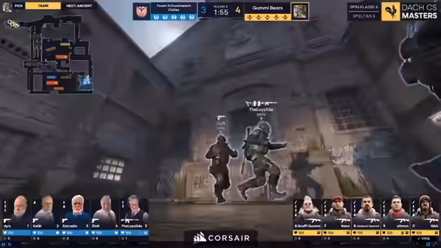04:23:32Das Match beginnt mit der Pistolenrunde, dem dritten Spiel der aktuellen Season. Im Gegensatz zur letzten Season kaufen die Oldies in dieser Runde nur minimales Utility, was sich als strategischer Fehler erweist, während die Gegner, die Bubbler Kiwis, mit voller Ausrüstung antreten. Tobi wirft eine Boost-Smoke, die aber von den Gegner bemerkt wird. Nach einem schwierigen Retake verlieren die Oldies die Runde und müssen nun in der ersten Full-Buy-Runde antreten.