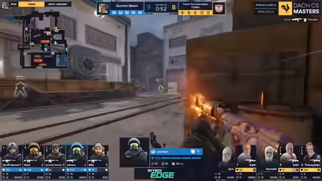 04:58:33Die Gummy Bears spielen extrem langsam und defensiv, eine Taktik, die den eher aggressiven Spielstil der Oldies aus dem Gleichgewicht bringt. Trotzdem kämpft das Oldies-Team tapfer und gewinnt mehrere Runden, die fast immer von Tobi mit entscheidenden Klatschen gerettet werden. Der erste Map-Endstand ist denkbar knapp mit 13:11 für die Oldies. Anschließend wechselt das Team auf die Map 'Train', bei der der Streamer große Sorge hat, da diese Map nicht zur Stärke des Teams zu passen scheint. Gleichzeitig erwähnt er die Bemühungen, Spieler wie Zion an das Werfen von Smokes zu gewöhnen.