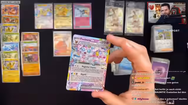 02:04:22Der Streamer öffnet mehrere Boxen des Sets, aber das Ergebnis bleibt hinter den Erwartungen zurück. Zwar werden einige Karten gezogen, darunter Blitzer EX, Felinara EX und eine Secret Rare Shugi, deren Wert jedoch enttäuschend niedrig ist. Als Highlight gilt eine einzige Meisterball-Karte. Der Streamer ist frustriert über die mangelnden Erfolge und spricht über zukünftige Pläne wie den Wechsel zu anderen Sprachversionen (Japanisch, Chinesisch) oder anderen Sammelkartenspielen, um bessere Hits zu erzielen.